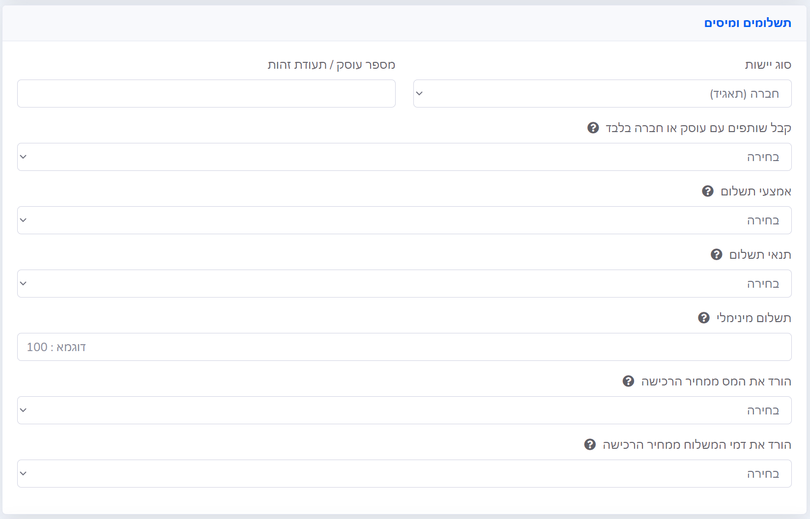 | סוג ישות | סוג היישות (לרוב חברה / עוסק מורשה / עוסק פטור) יופיעו אוטומטית מפרטי החשבון אך תוכלו לשנות אותם כאן |