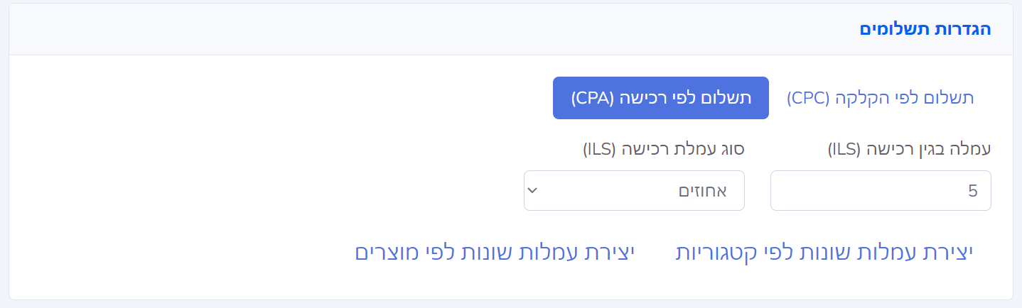 - בחרו ביצירת עמלות שונות לפי קטגוריות או עמלות שונות לפי מוצרים