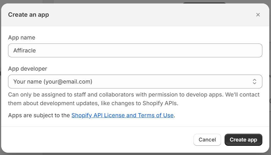5. בחלון Create an app רשמו את השם Affiracle בשדה App name ובחרו באימייל שלכם או בשל מנהלי החנות בתיבת הבחירה, ולחצו על Create app