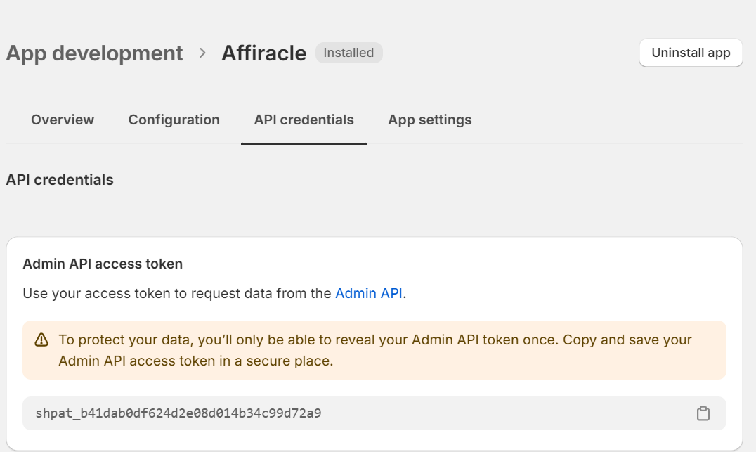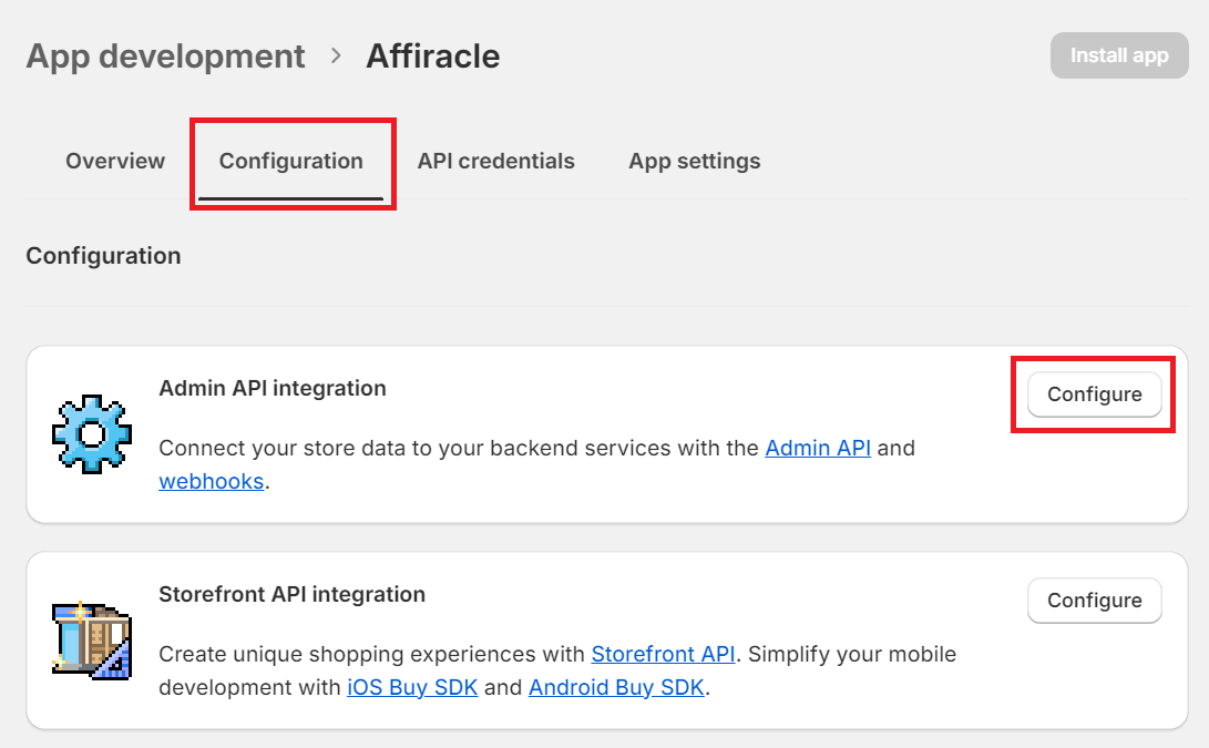 6. לאחר יצירת ה App תגיעו לחלון הגדרות בו תעברו אל טאב ה Configuration שם לחצו על כפתור ה Configure בשורת ה Admin API integration.