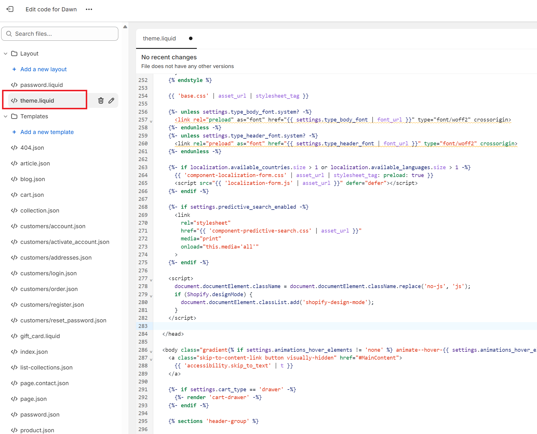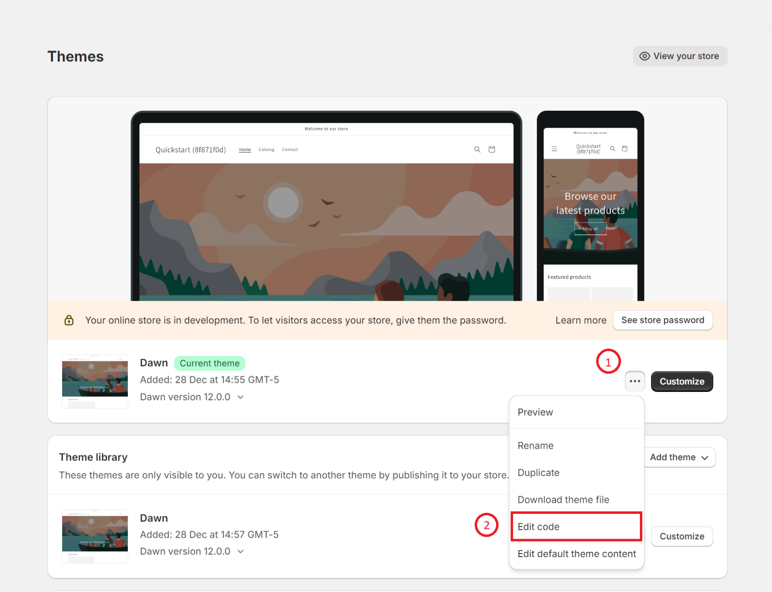 2. מצאו את תבנית העיצוב הפעילה שלכם ובתפריט לחצו על Edit code