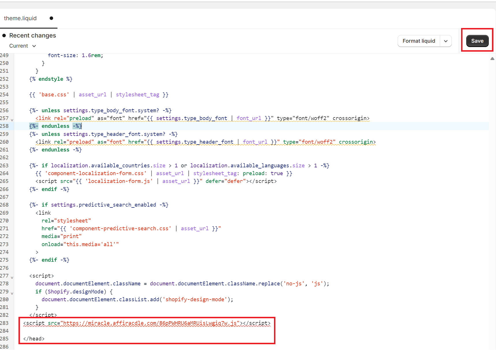 4. הדביקו את הסקריפט שקיבלתם בדיוק מעל תגית ה- </head> ולחצו על Save לשמירה