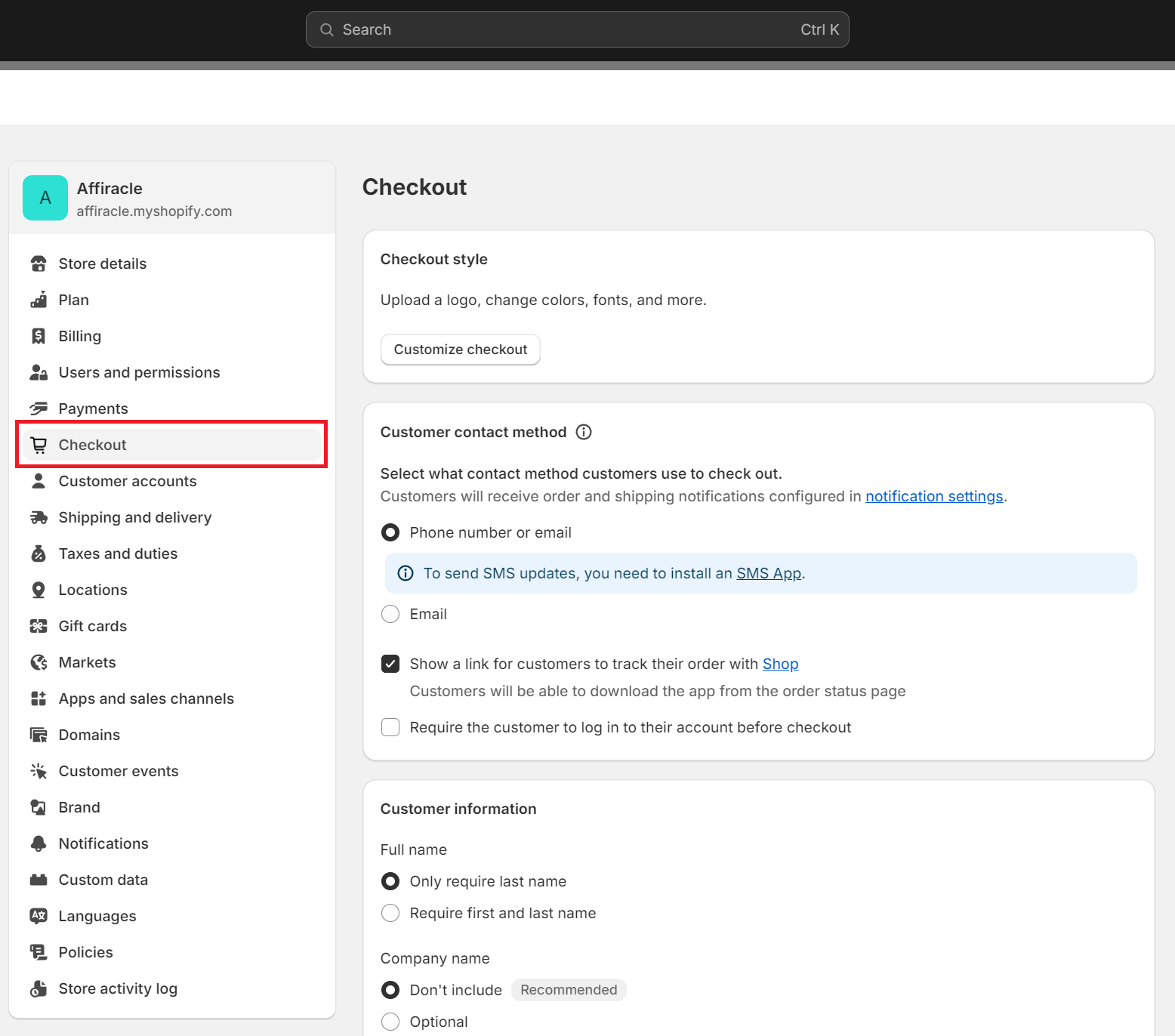 2. בעמוד ההגדרות לחצו על תפריט ה Checkout