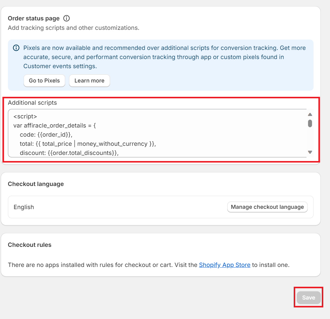 5. הדביקו את הקוד בתוך תיבת Additional scripts ולחצו על כפתור ה Save